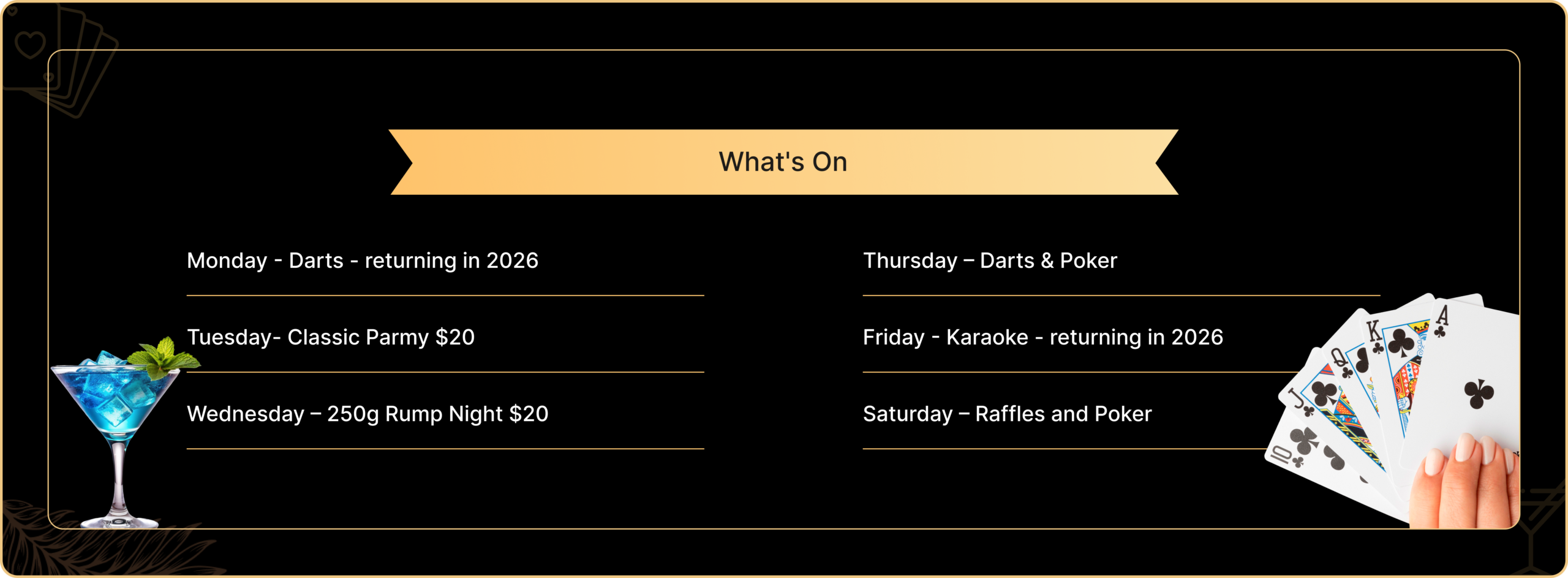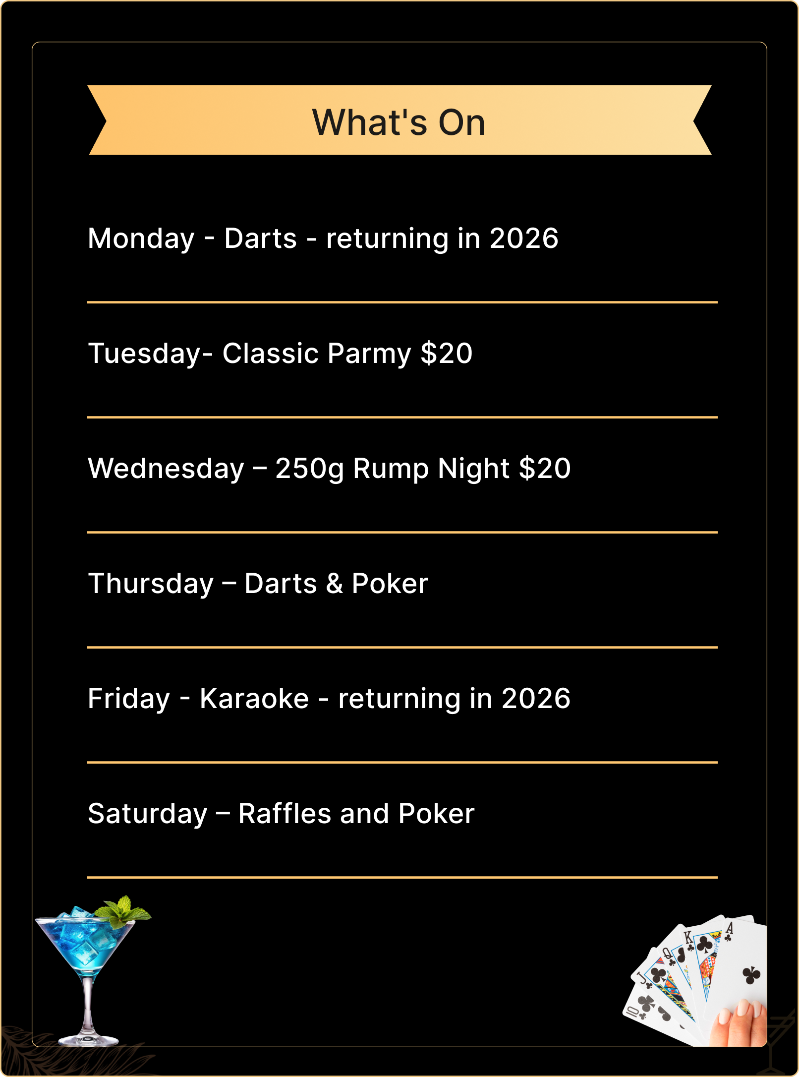 Kaden LuckTrustindex verifies that the original source of the review is Google. Amazing prawns with creamy rice, cheese pizza and chips were great too Lachlan DukeTrustindex verifies that the original source of the review is Google. The boys at work said this pub had good food. Finally got around to giving it a go and wow! My parmy was one of the best I've ever had! So good, the salad was fresh and had a nice twist, chips extra crunchy, parmy delicious. Definitely coming back. A bit on the expensive side but well worth it. josefina matusTrustindex verifies that the original source of the review is Google. Was a very nice experience, the kitchen was closed and they take our order like a favor, the food was fast and delicious. The k you for everything xx Robyn SargentTrustindex verifies that the original source of the review is Google. Passing through town, was recommended to have a feed here, ended up being a great suggestion, Great T Bone, one of the best - perfectly cooked and tender. Well done guys! Laurie BridgesTrustindex verifies that the original source of the review is Google. An obvious night time party venue, but it was lunch and we were looking for burgers and a beer. Only a few people there. OMG the best burger I've been looking for for ages. Beef, bacon, egg cheese and salad... 'with' beetroot ✔️. Plus a serve of chunky chips, no skinny fries here. The bar staff who took my order was friendly, and the chef/cook who brought out the meals was proud of her burger... well done guys.